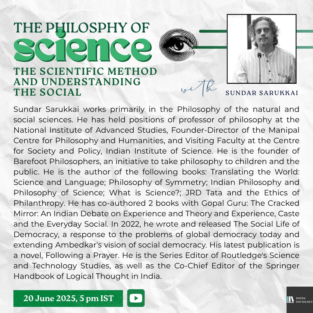 Sundar Sarukkai works primarily in the Philosophy of the natural and social sciences. He has held positions of professor of philosophy at the National Institute of Advanced Studies, Founder-Director of the Manipal Centre for Philosophy and Humanities, and Visiting Faculty at the Centre for Society and Policy, Indian Institute of Science. He is the founder of Barefoot Philosophers, an initiative to take philosophy to children and the public. He is the author of the following books: Translating the World: Science and Language; Philosophy of Symmetry; Indian Philosophy and Philosophy of Science; What is Science?; JRD Tata and the Ethics of Philanthropy. He has co-authored 2 books with Gopal Guru: The Cracked Mirror: An Indian Debate on Experience and Theory and Experience, Caste and the Everyday Social.  In 2022, he wrote and released The Social Life of Democracy, a response to the problems of global democracy today and extending Ambedkar’s vision of social democracy. His latest publication is a novel, Following a Prayer. He is the Series Editor of Routledge’s Science and Technology Studies, as well as the Co-Chief Editor of the Springer Handbook of Logical Thought in India