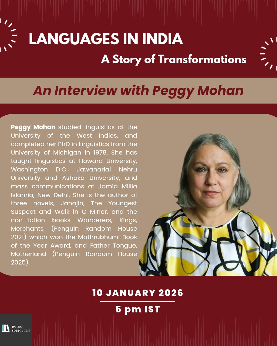 Peggy Mohan studied linguistics at the University of the West Indies, and completed her PhD in linguistics from the University of Michigan in 1978. She has taught linguistics at Howard University, Washington D.C., Jawaharlal Nehru University and Ashoka University, and mass communications at Jamia Millia Islamia, New Delhi. She is the author of three novels, Jahajin, The Youngest Suspect and Walk in C Minor, and the non-fiction books Wanderers, Kings, Merchants, (Penguin Random House 2021) which won the Mathrubhumi Book of the Year Award, and Father Tongue, Motherland (Penguin Random House 2025).