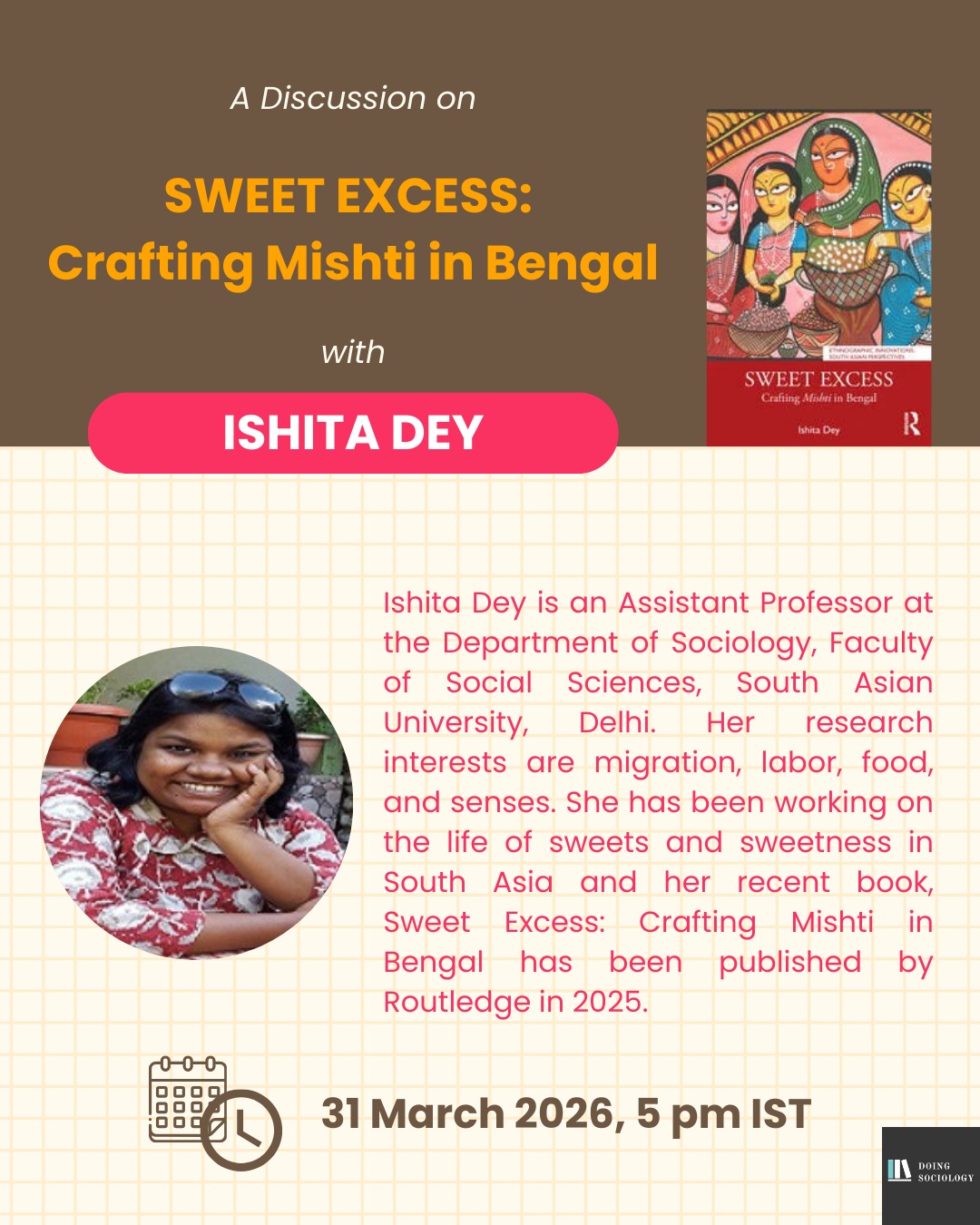 Ishita Dey is an Assistant Professor at the Department of Sociology, Faculty of Social Sciences, South Asian University, Delhi. Her research interests are migration, labor, food, and senses. She has been working on the life of sweets and sweetness in South Asia and her recent book, Sweet Excess: Crafting Mishti in Bengal has been published by Routledge in 2025.